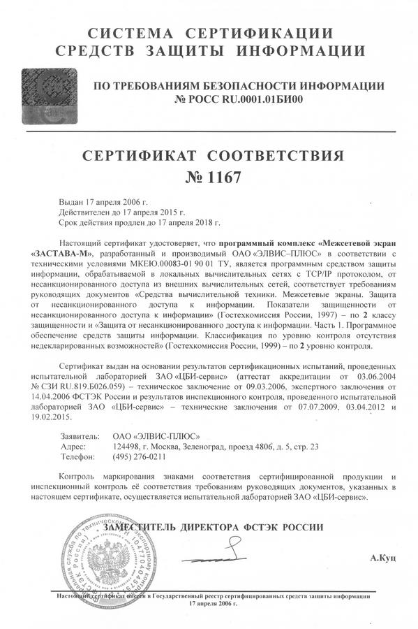 Продлён сертификат соответствия ФСТЭК России №1167 на программный комплекс «Межсетевой экран „ЗАСТАВА-М“», подтверждающий соответствие продукта компании ЭЛВИС-ПЛЮС требованиям руководящих документов по защите от несанкционированного доступа по 2 классу защищённости (НСД-2) и отсутствию недекларированных возможностей по 2 уровню контроля (НДВ-2).