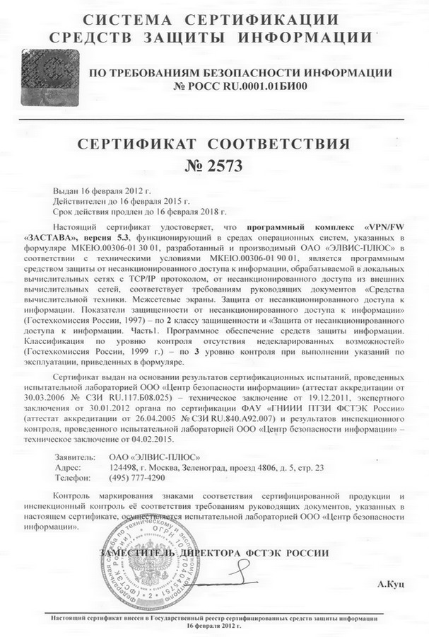 Продлено действие сертификата ФСТЭК России № 2573 до 16 февраля 2018 года.